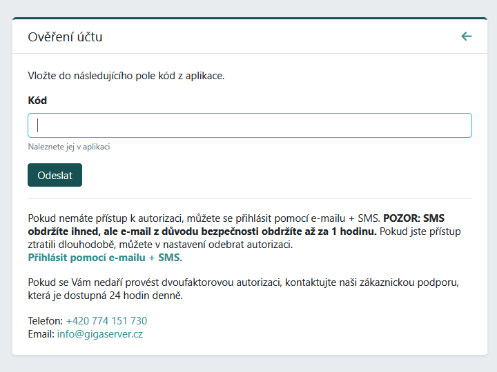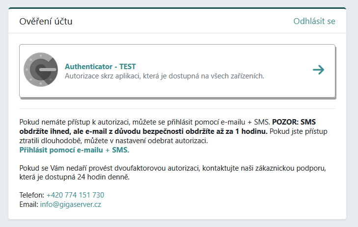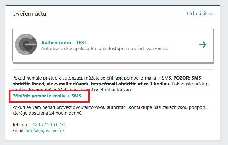 V případě, že máte aktivovanou dvoufaktorovou autorizaci ale nemáte přístup k samotné autorizační aplikaci nebo zařízení, je možné přihlášení autorizovat pomocí e-mailu a SMS, kde Vám budou zaslány potvrzovací kódy. O tento způsob potvrzení můžete zažádat na stránce s výběrem autorizační aplikace po přihlášení do uživatelské sekce.