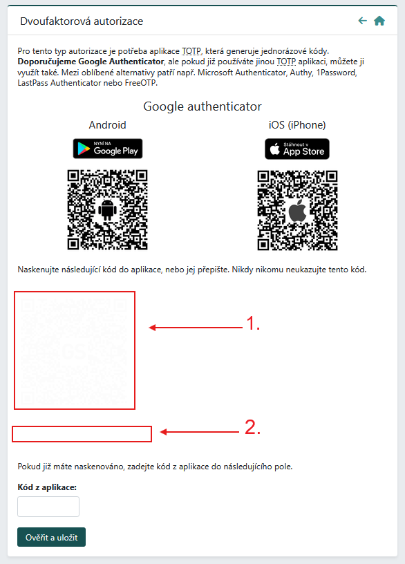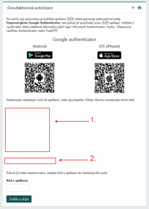 V následujícím kroku je potřeba přidat účet do autorizační aplikace pomocí QR kódu (bod 1) nebo manuálním zadáním kódu do autorizační aplikace (bod 2). Jakmile účet do aplikace přidáte, bude se každých 30 sekund generovat jednorázový kód. Aktuální kód je třeba zadat do pole ‘Kód z aplikace’. Odesláním aktuálního kódu dokončíte celý proces přidání dvoufaktorové autorizace k Vašemu uživatelskému přihlášení.