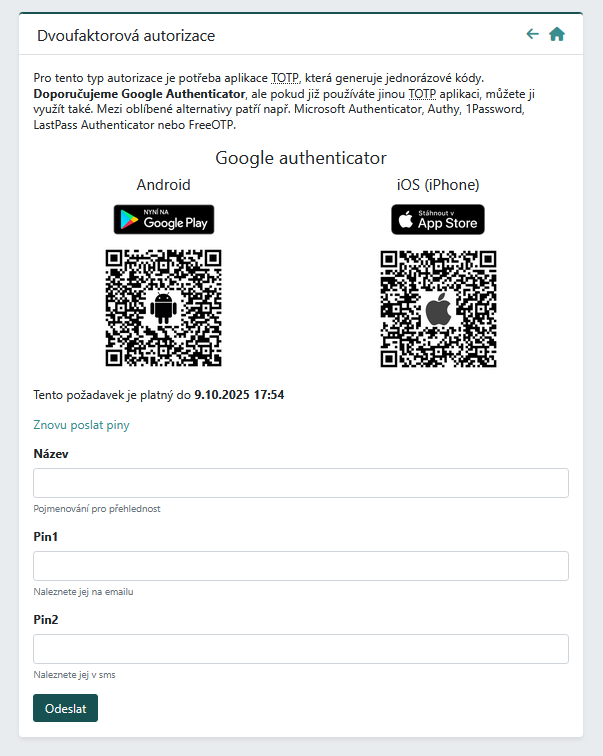 Jakmile budete mít příslušnou aplikaci staženou, pokračujte kliknutím na tlačítko ‘Poslat pin’. Po kliknutí se Vám zobrazí tři textová pole. V prvním poli lze nastavit název, který se bude zobrazovat v autorizační aplikaci a v následujicích polích je následně potřeba vložit PIN kódy, které Vám budou zaslány prostřednictvím e-mailu a SMS.