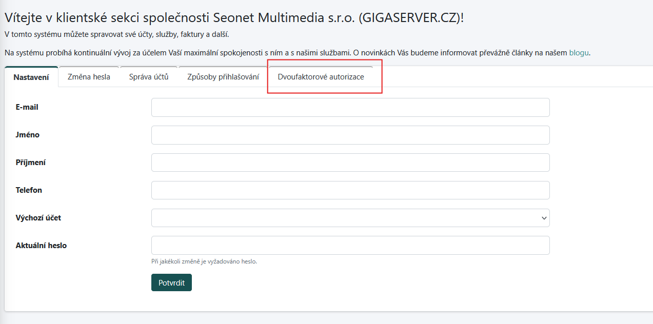 obr. 1 – sekce dvoufaktorové autorizace ve vlastním profilu