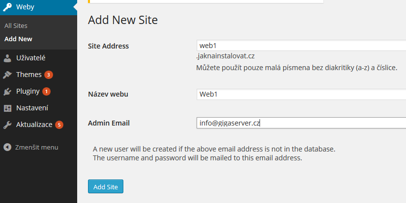 6. Založení nových webů – po kliknutí na sekci “Weby” se zobrazí tlačíko “Add new”, což znamená přidání nového webu do sítě. Nejdříve je nutné dopsat URL adresu nového webu a následně vyplnit název webu a e-mail administrátora. Následně je nutné kliknout na “Add site”. Tímto způsobem můžete přidat libovolný počet webů.